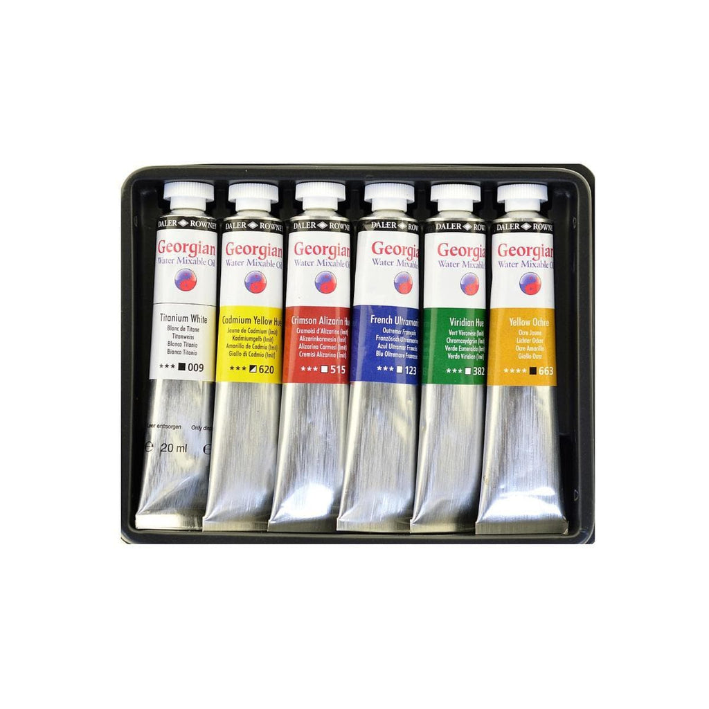 Unleash your creativity with the Daler Rowney Georgian Watermixable Oil Set, featuring 6 vibrant colors in 20ml tubes. Perfect for artists who want the traditional texture and depth of oil paints without harsh solvents, this set allows for easy mixing and blending. Each tube offers rich pigmentation and excellent lightfastness, ensuring your artwork remains vibrant over time. Whether you're working in the studio or outdoors, these watermixable oils can be thinned with water or combined with mediums, making them ideal for a variety of techniques. Perfect for artists of any skill level.